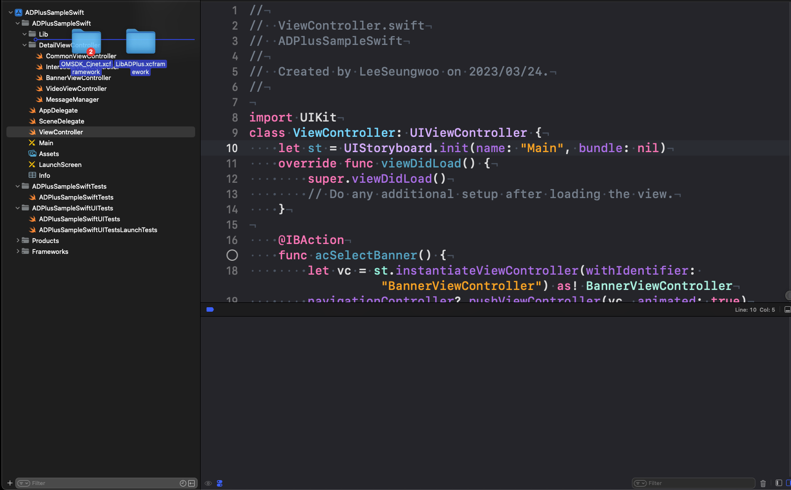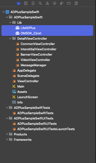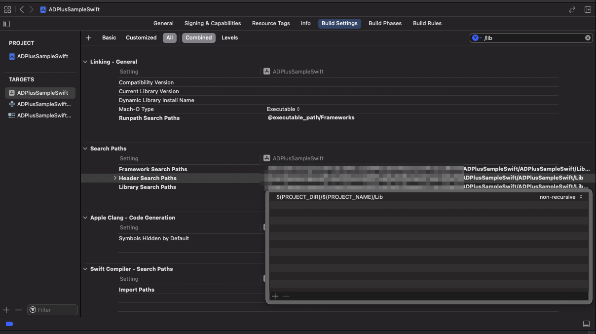 Project 선택 -> Target 선택 -> Build Settings탭 선택 -> Search Paths 항목으로 이동합니다. “Framework Search Paths”,”Header Search Paths”,”Library Search Paths”에 각각 추가한 라이브러리의 경로를 입력합니다. Sample Project의 경우 ADPlusSampleSwift/ADPlusSampleSwift/Lib 로 되어있어 “$(PROJECT_DIR)/$(PROJECT_NAME)/Lib”로 추가함으로써 라이브러리 사용환경을 완료합니다.