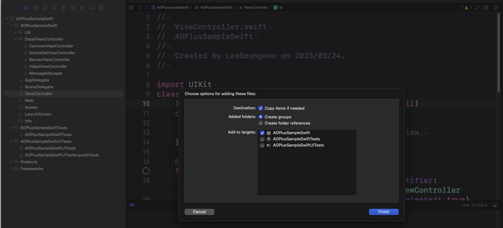 Added folders는 “Create groups”를 선택 적용할 Target앱을 선택후 “Finish”를 선택하면 프로젝트에 라이브러리 추가됩니다.