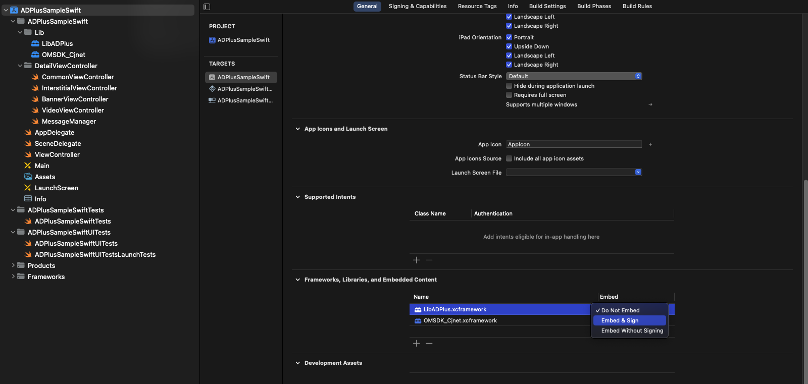Project 선택 -> Target 선택 -> General탭 선택-> “Frameworks,Libraries, and Embedded Content” 항목으로 이동합니다. 추가한 두개의 Library의 Embed option을 “Do Not Embed”에서 “Embed & Sign”으로 변경합니다.